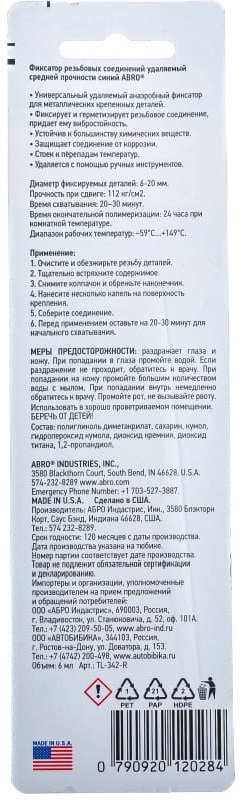 Фиксатор резьбы ABRO средняя фиксация синий 6мл TL342R